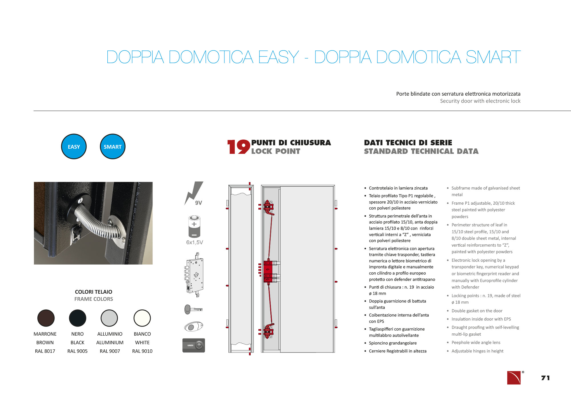 Le porte blindate modello DOPPIA DOMOTICA EASY e DOPPIA DOMOTICA SMART hanno la serratura azionata con cilindro a profilo europeo e 19 punti totali di chiusura.